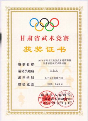 2023年年甘肃省传统武术锦标赛学员获奖证书